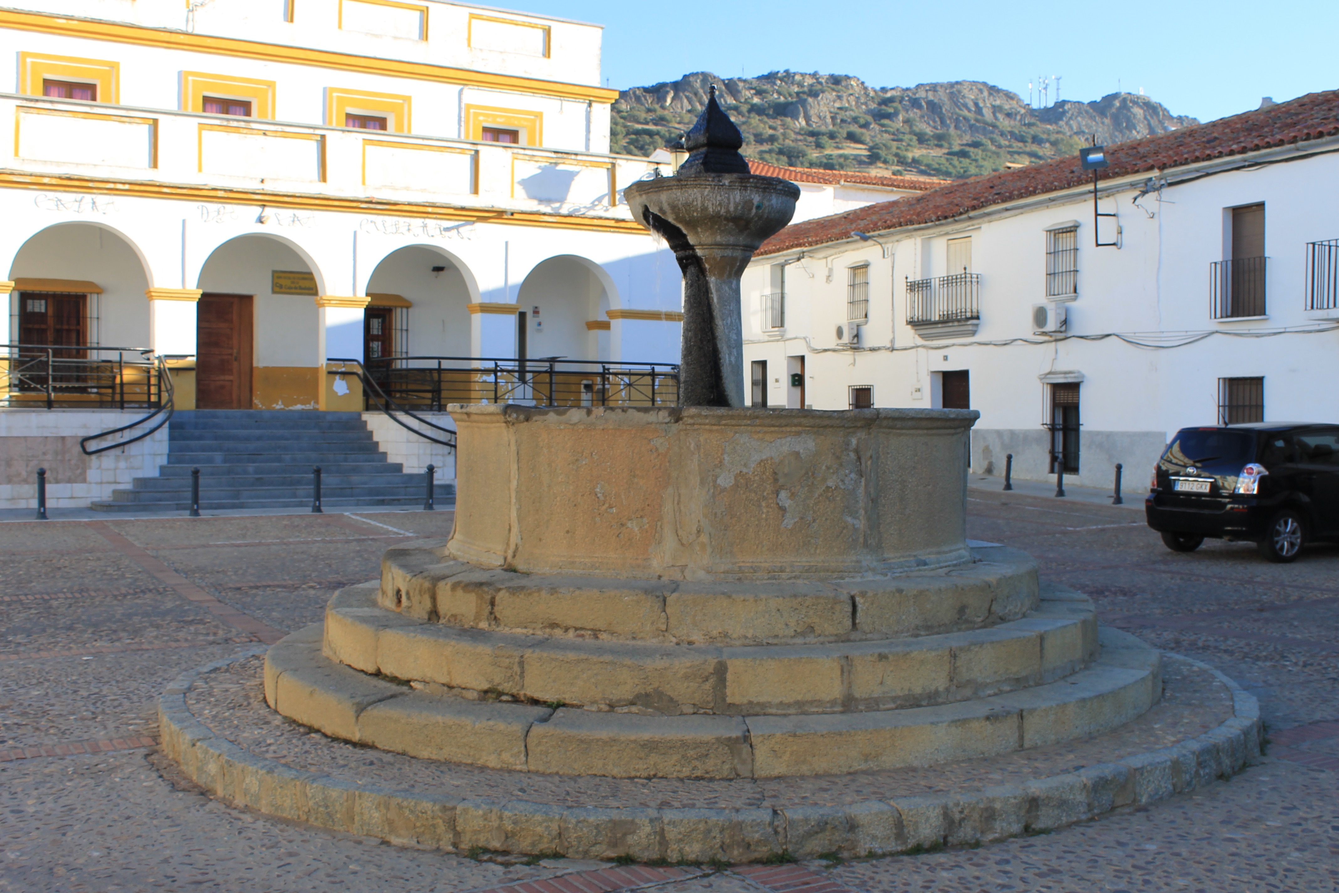 In the cobbled Plaza Mayor we find the Town Hall, porticoed, as well as a pyramidal granite fountain.